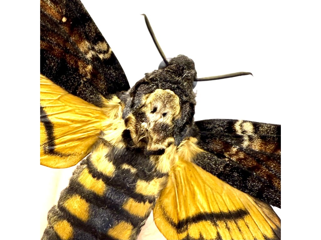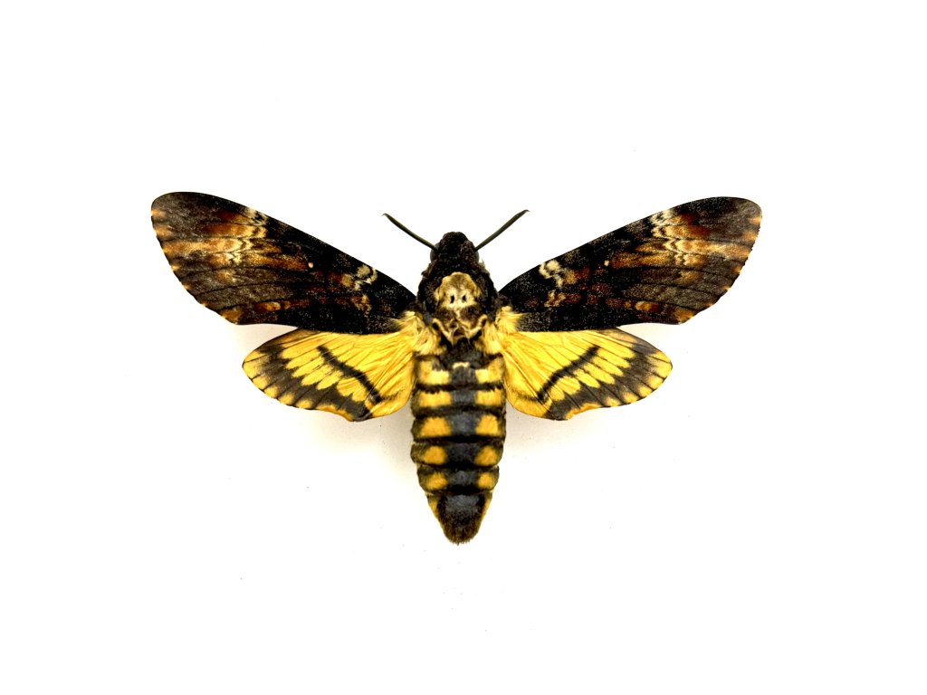 Exemplár nočného motýľa Lišaj smrtihlav (Acherontia atropos) v "sáčkovanom" stave - to znamená, že motýľa je potrebné po navlhčení vypreparovať pre následné uloženie do zbierky alebo rámu.