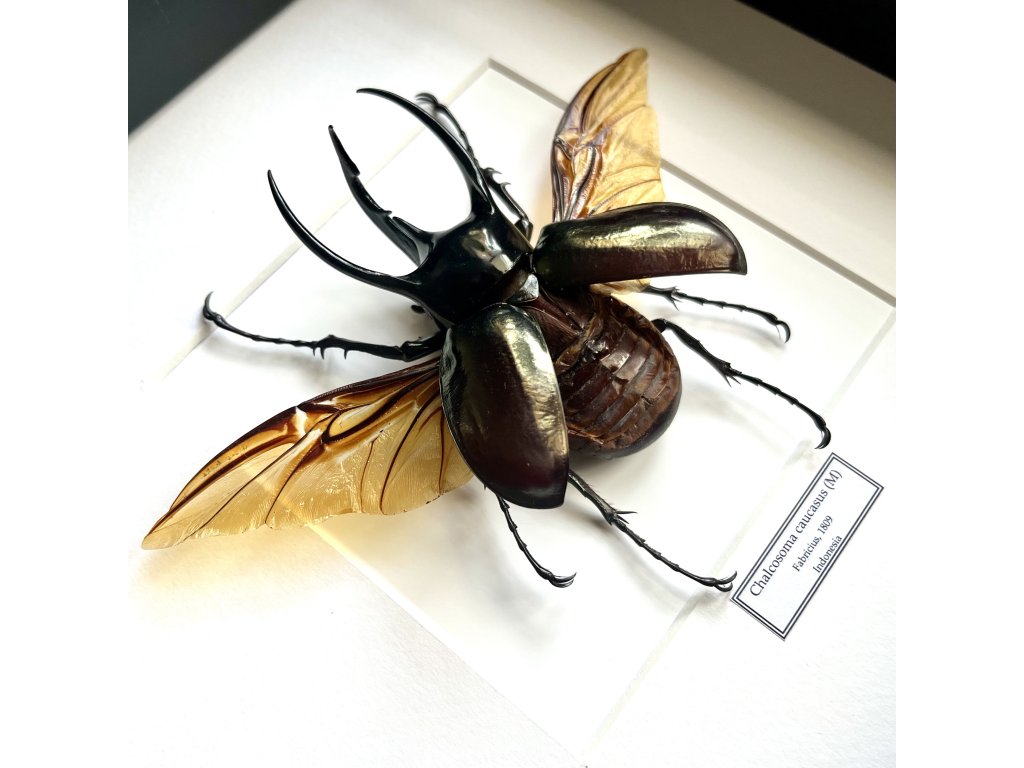 Predstavujeme vám skutočného obra sveta chrobákov – Chalcosoma caucasus, jedného z najväčších a najsilnejších nosorožtekov na svete. Tento impozantný druh pochádzajúci z tropických dažďových pralesov juhovýchodnej Ázie vyniká svojim kovovo lesklým čiernym telom a mohutnými rohmi, ktoré mu dodávajú vzhľad mytologického bojovníka.