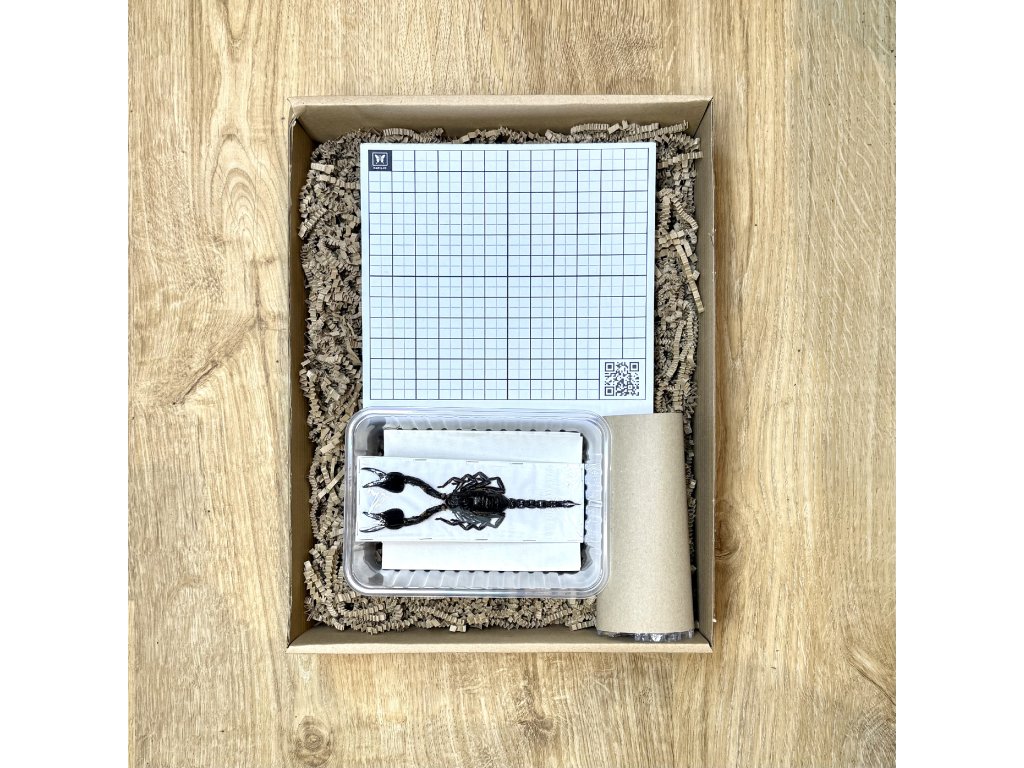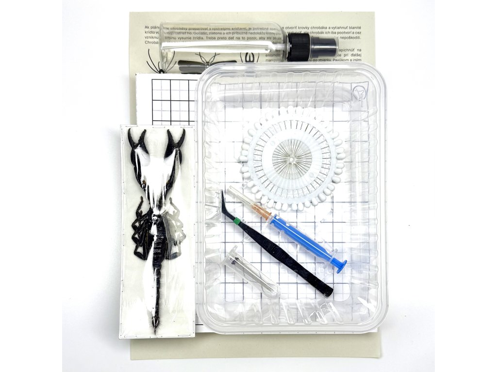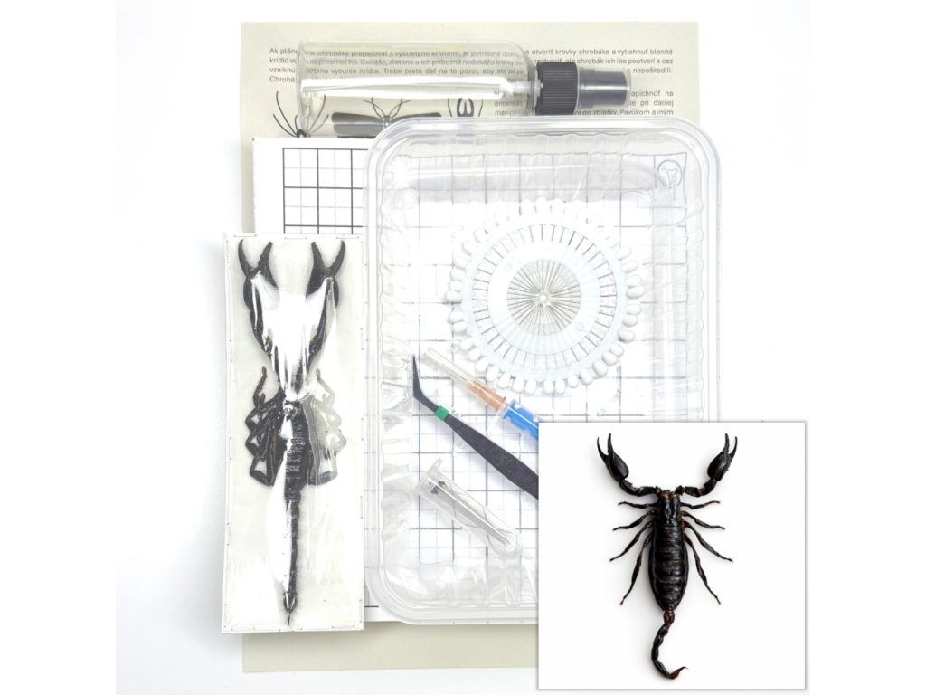 Entomologická sada s pomôckami na preparáciu hmyzu vrátane návodu a samotného exempláru škorpióna Heterometrus cyaneus na preparovanie. Idálne pre ľudí, ktorí so chcú po svojom vypreparovať chrobáka alebo škorpióna do svojej zbierky alebo rámu.