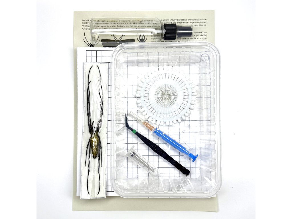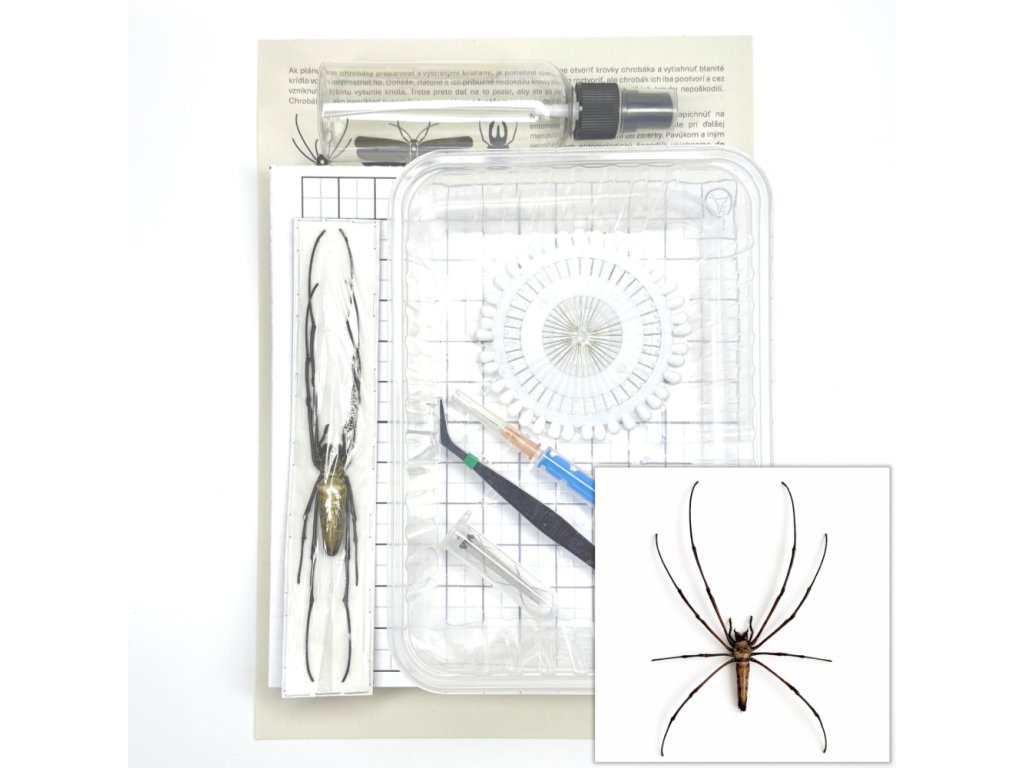 Entomologická sada s pomôckami na preparáciu hmyzu vrátane návodu a samotného exempláru pavúka Nephila pilipes na preparovanie. Idálne pre ľudí, ktorí so chcú po svojom vypreparovať pavúka do svojej zbierky alebo rámu.