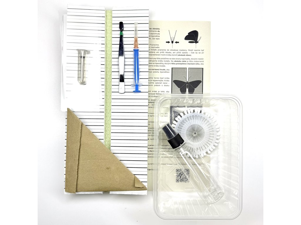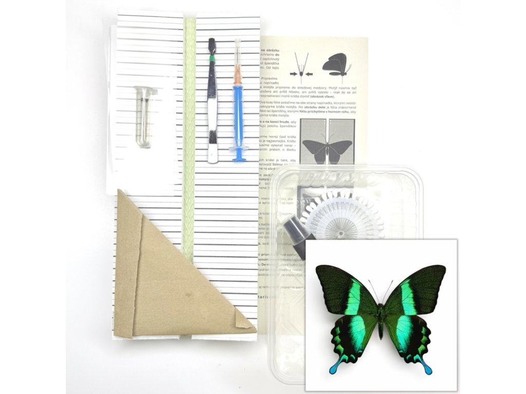 Entomologická sada s kompletnými pomôckami na preparáciu motýľov vrátane exempláru motýľa Papilio blumei. Idálne pre ľudí, ktorí so chcú po svojom vypreparovať motýľa do svojej zbierky alebo rámu.