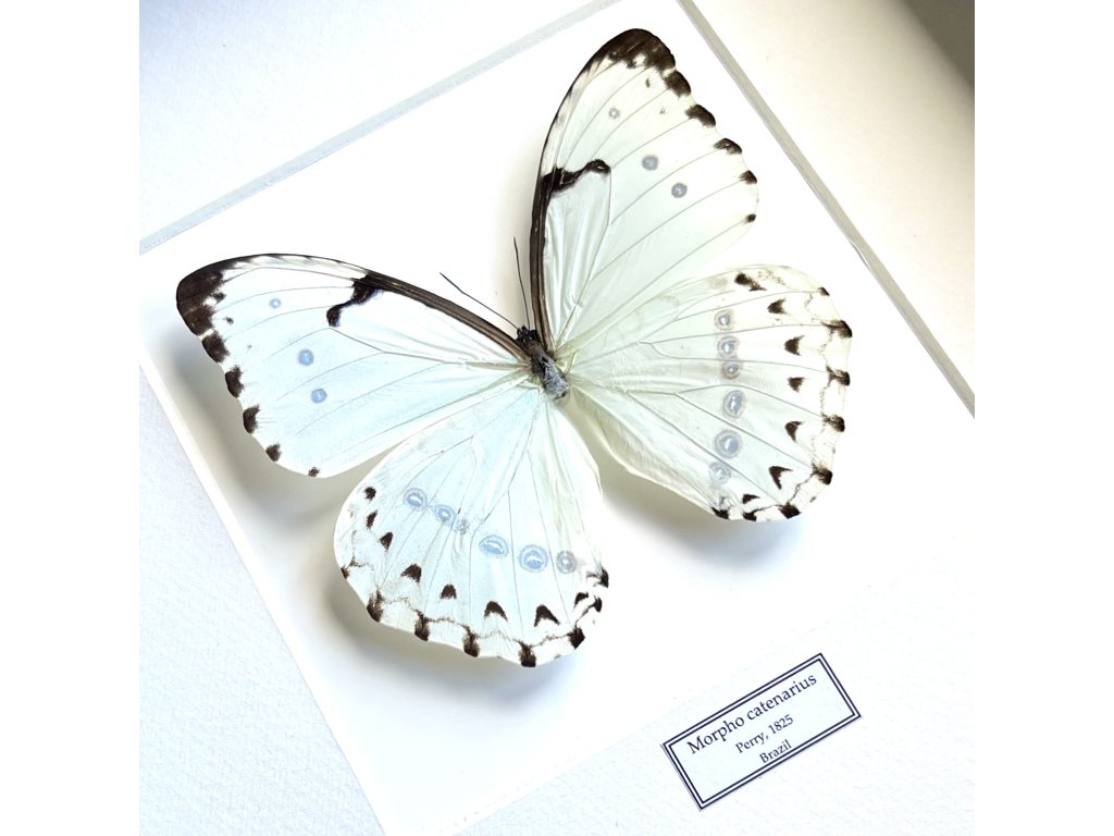 Motýľ Morpho catenarius patrí medzi ikonické druhy s nezameniteľným vzhľadom. Jeho jemne perleťové krídlas nádychom striebornej farby odrážajú svetlo, čím vytvárajú fascinujúci efekt, ktorý pripomína hru svetla a tieňa. Tento druh pochádza z tropických lesov Južnej Ameriky, kde je symbolom čistoty a éterickej krásy.