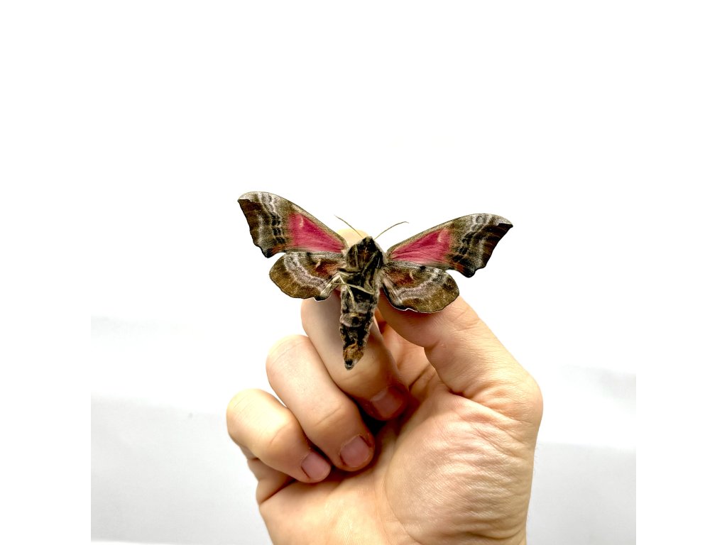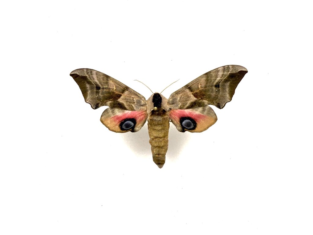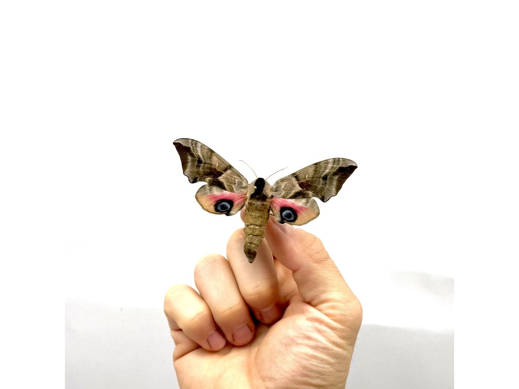 Elegantný európsky nočný motýľ Smerinthus ocellatus, známy ako Lišaj pávooký, je charakteristický svojimi ružovo-hnedými krídlami a výraznými modrofialovými očkovitými škvrnami na zadných krídlach. Tieto „oči“ slúžia ako obranný mechanizmus a pri roztiahnutí krídel vytvárajú pôsobivý vizuálny efekt. Ide o atraktívny druh s jemnou textúrou krídel, ktorý výborne doplní európske entomologické zbierky.Exemplár pochádza z nášho vlastného kontrolovaného odchovu, takže nejde o odchyt z voľnej prírody, ale eticky získaný kus vhodný pre zberateľov.