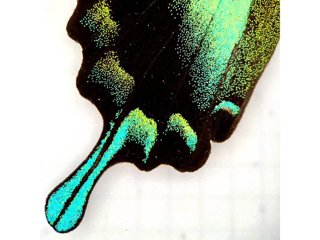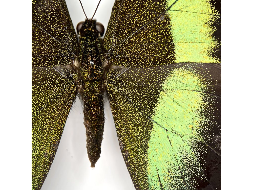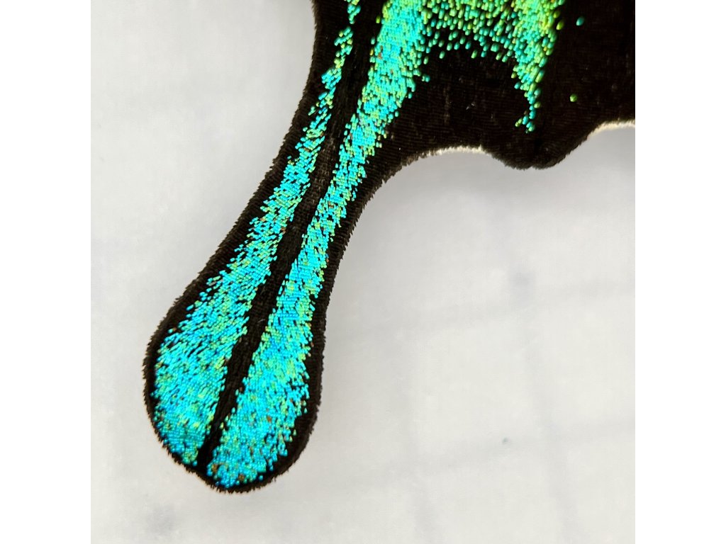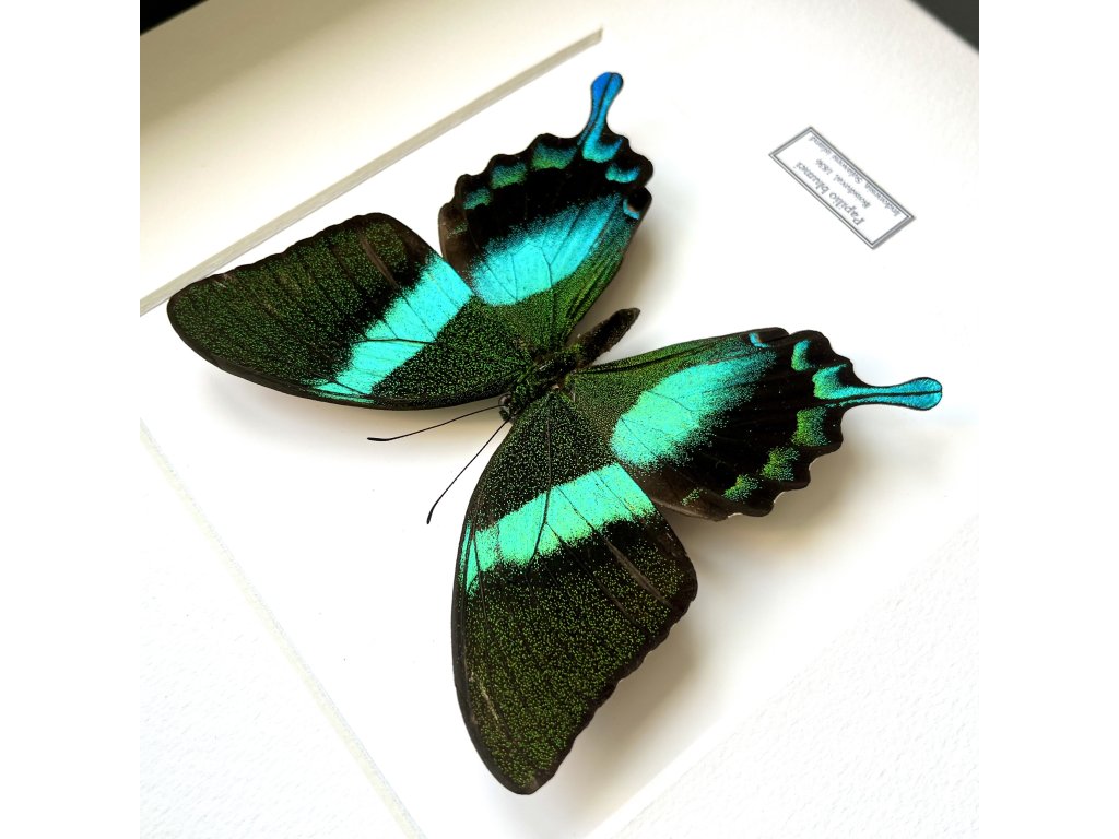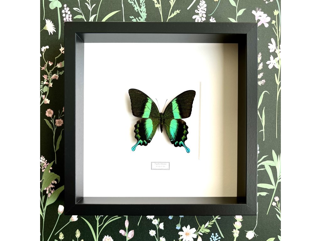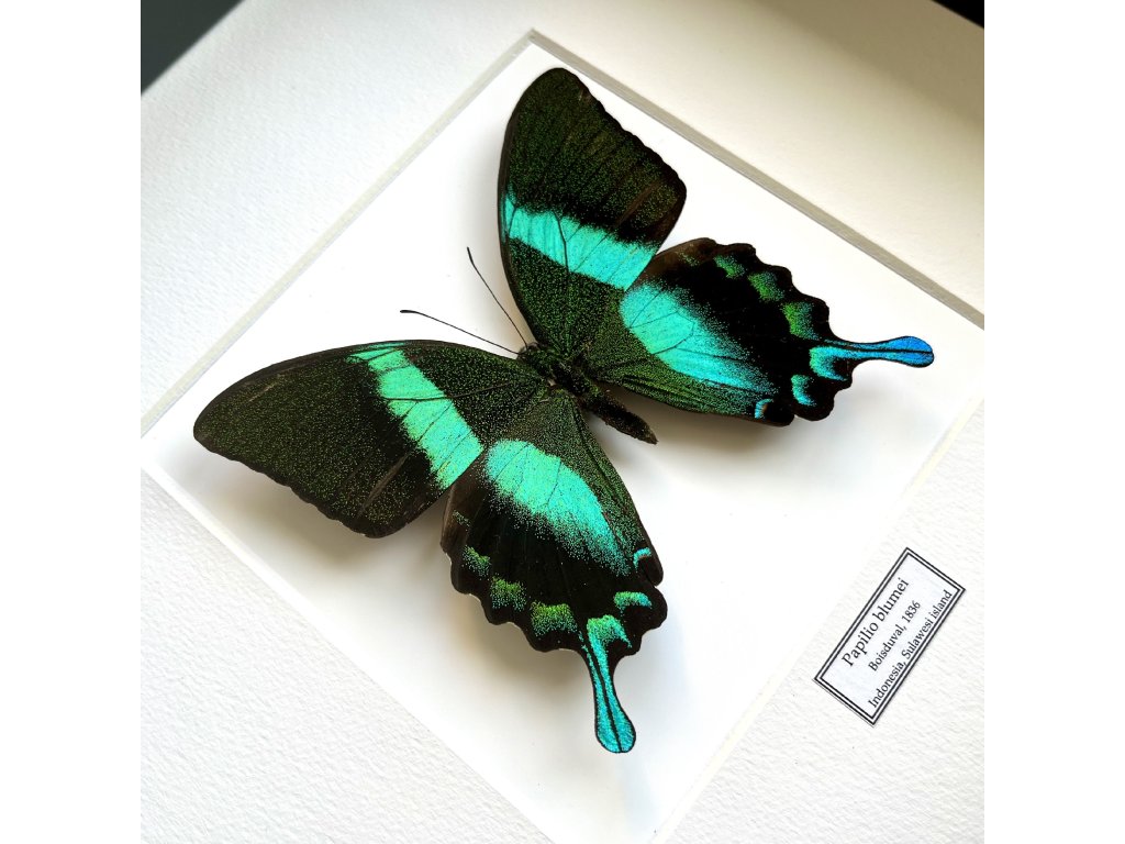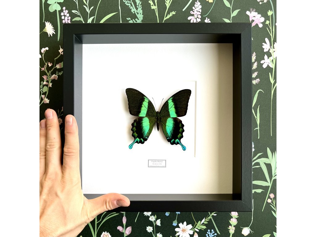Pridajte do svojho priestoru fascinujúcu harmóniu farieb a svetla so smaragdovým motýľom Papilio blumei.
