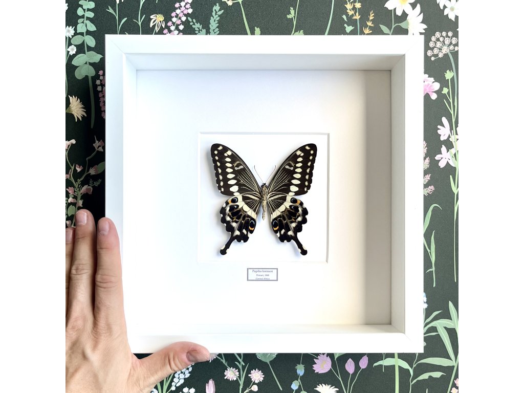 Papilio lormieri je nádherný motýľ pochádzajúci z tropických lesov západnej Afriky, najmä z oblastí ako Ghana, Sierra Leone a Pobrežie Slonoviny. Svojimi kontrastnými čierno-bielymi krídlami s jemnými červenými detailmi okamžite zaujme a prinesie nádych exotiky do každého interiéru. Tento zarámovaný exemplár je precízne spracovaný, aby zachoval jeho jedinečnú krásu a eleganciu. Je ideálny ako dekorácia pre váš domov, kanceláriu alebo štúdio a predstavuje aj skvelý darček pre tých, ktorí ocenia prírodné umenie a rozmanitosť hmyzieho sveta.