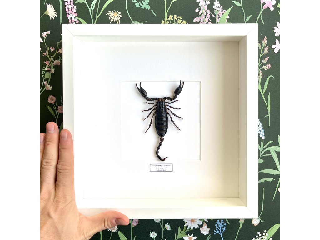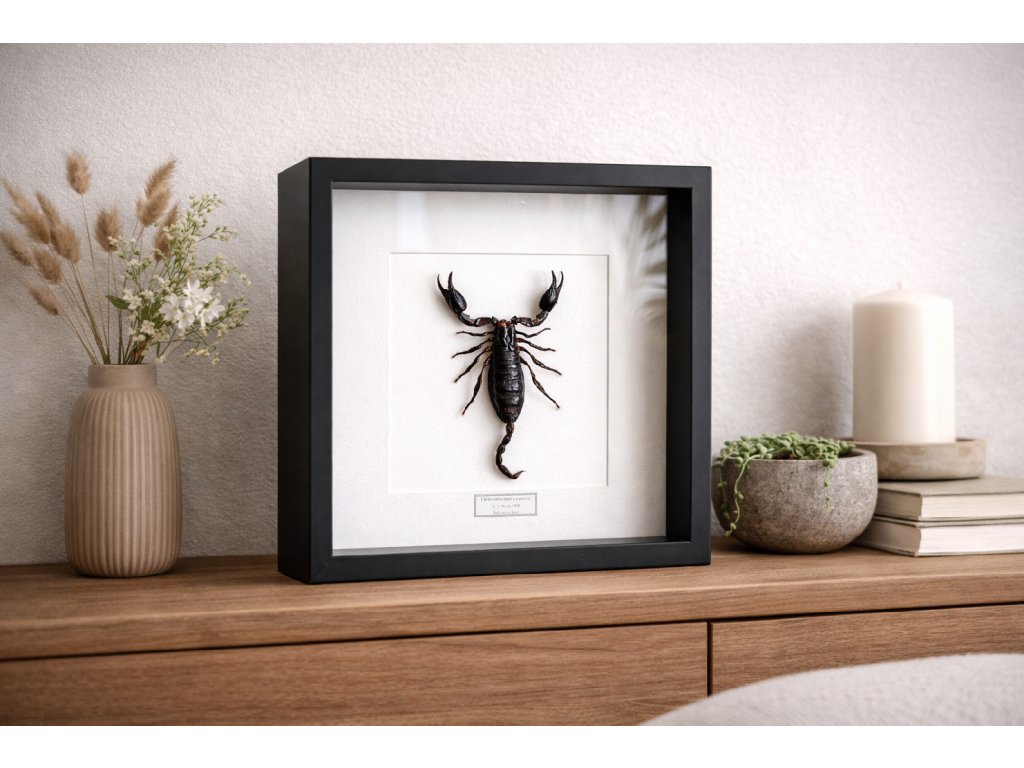 V prírode zohráva dôležitú úlohu v ekosystéme ako regulátor populácií drobného hmyzu. Tento unikátny škorpión je umiestnený v kvalitnom ráme, ktorý podčiarkuje jeho majestátnosť a ochraňuje ho pred poškodením. Ideálny ako zberateľský kúsok, dekorácia do interiéru alebo ako originálny darček pre milovníkov exotického hmyzu a zvierat.